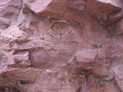 やはり、「水」を求めて谷間に住んだインディヘナ達が残した数々のロックペインティングのうちのひとつ、Cuebas Pintas(クエバス・ピンタス)は、その名のとおり、ロレトから車で1時間ほど山に入ったところに流れる小川の脇の小さな洞窟に描かれたものだ。緑を求め生きたモンゴロイドの人々の生活を想像したくなる。